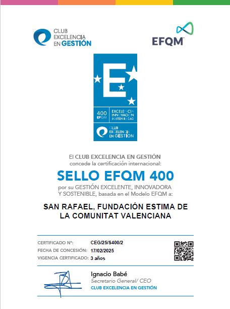 San Rafael – Fundación Estima posee la certificación internacional Sello EFQM +400 por su gestión excelente, innovadora y sostenible. Certificación del Club de Excelencia en Gestión para tres años desde febrero de 2025.